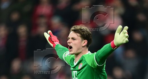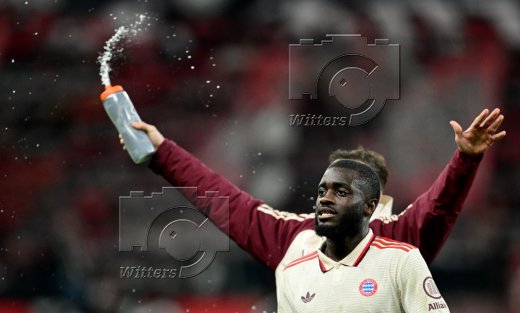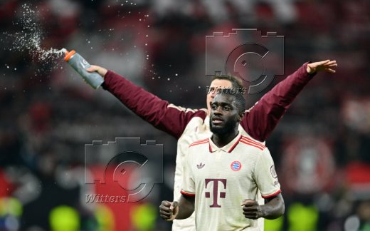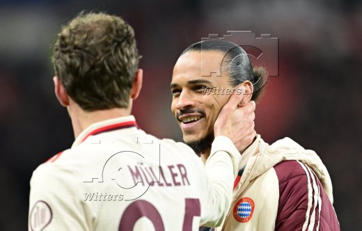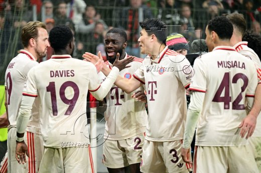 Schlussjubel v.l. Joao Palhinha, Sacha Boey, Torwart Daniel Peretz, Gabriel Vidovic, Harry Kane, Serge Gnabry, Thomas Mueller (Bayern)