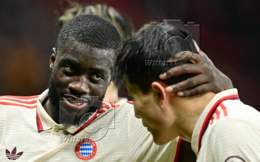 v.l. Dayot Upamecano, Victor Boniface, Leon Goretzka (Bayern)