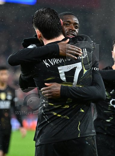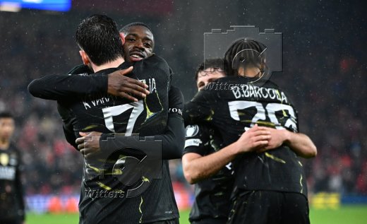 v.l. Torwart Giorgi Mamardashvili (Liverpool), Milos Kerkez, Achraf Hakimi (PSG)
