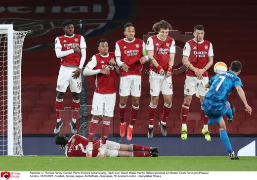 Freistoss v.l. Thomas Partey, Gabriel, Pierre-Emerick Aubameyang, David Luiz, Granit Xhaka, Hector Bellerin (Arsenal) am Boden, Costs Fortounis (Piraeus)