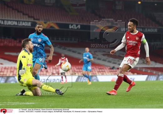 v.l. Torwart Jose Sa (Piraeus), Pierre-Emerick Aubameyang (Arsenal)