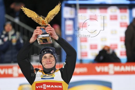 Gesamtsieger Domen Prevc (Slowenien) mit Adler-Pokal