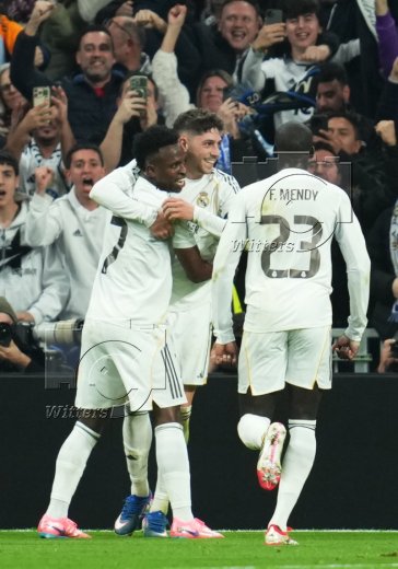 2:0 Tor, Jubel, v.l. Vinicius Junior , Torschuetze Federico Valverde, Ferland Mendy (Real)
