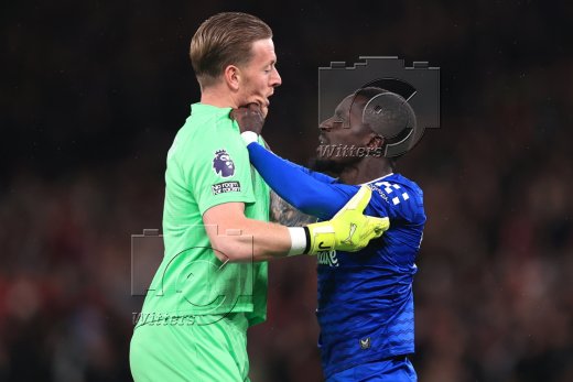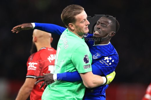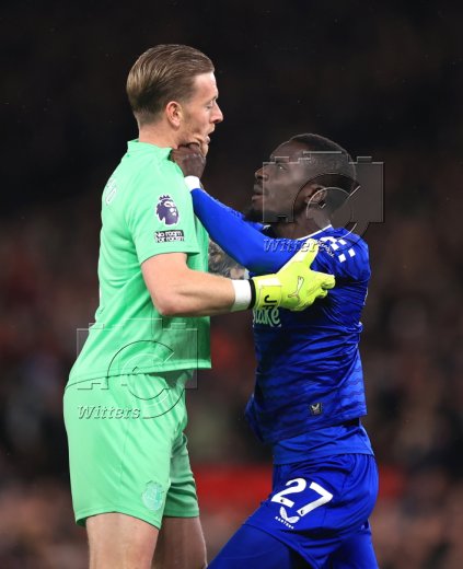 Streit zwischen den Teamkolllegen Torwart Jordan Pickford (Everton, l.) und Idrissa Gueye, nachdem Gueye den Teamkollegen Michael Keane (Everton, nicht im Bild) geohrfeigt und dafuer die Rote Karte gesehen hatte