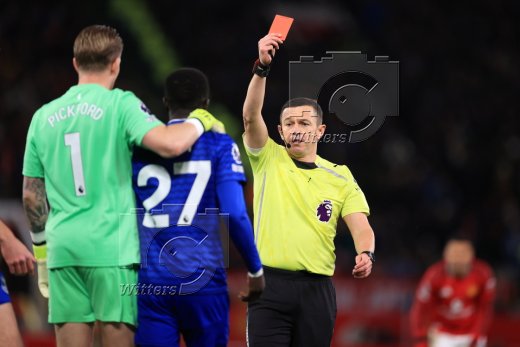 Schiedsrichter Tony Harrington zeigt Teamkolllegen Idrissa Gueye (Everton, M.) die Rote Karte, nachdem er seinen Teamkollegen Michael Keane geohrfeigt hatte, Torwart Jordan Pickford (Everton, l.)