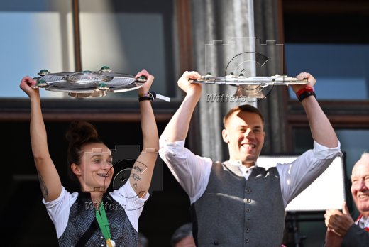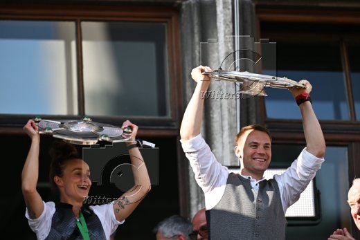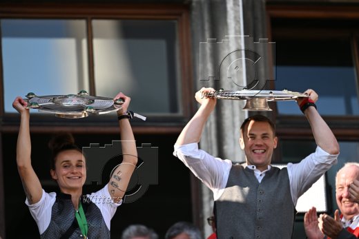 v.l. Lina Magull (FC Bayern Frauen, Bundesliga-Meister 2023) mit Schale, Torwart Manuel Neuer mit Schale