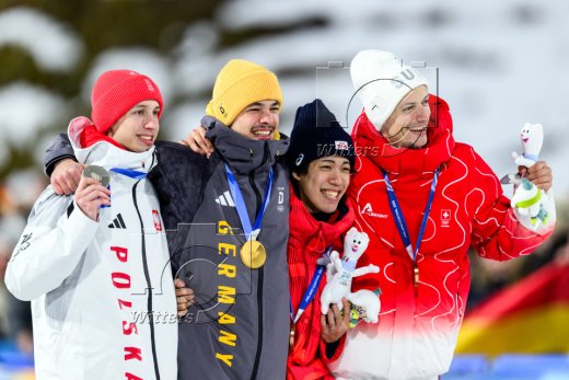 v.l. Kacper Tomasiak (Polen, Silber), Olympiasieger Philipp Raimund (Deutschland), Ren Nikaido (Japan, Bronze), Gregor Deschwanden (Schweiz, Bronze)