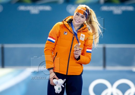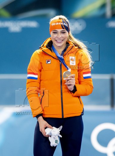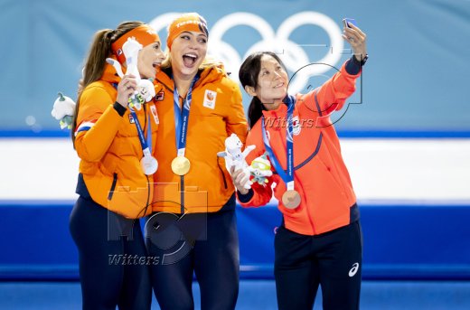 v.l. Femke Kok (Niederlande, Silber), Olympiasiegerin Jutta Leerdam (Niederlande), Miho Takagi (Japan, Bronze)