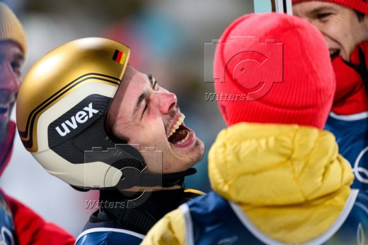 v.l. Pius Paschke (Deutschland), Olympiasieger Philipp Raimund (Deutschland, Gold), Andreas Wellinger (Deutschland), Felix Hoffmann (Deutschland)