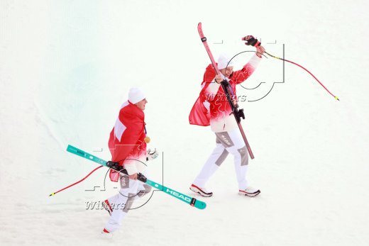 v.l. Olympiasieger Franjo von Allmen (Schweiz), Marco Odermatt (Schweiz, Bronze)