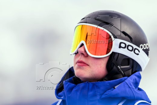 Vladyslav Heraskevych (Ukraine) mit Helm, auf dem 24 im Krieg von Russland gegen die Ukraine getoetete ukrainische Sportler und Sportlerinnen zu sehen sind
