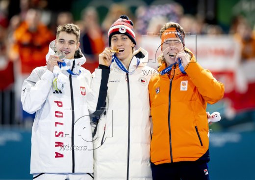 v.l. Vladimir Semirunniy (Polen, Silber), Olympiasieger Metodej Jilek (Tschechien), Jorrit Bergsma (Niederlande, Bronze)
