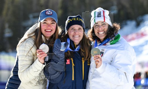 v.l. Thea Louise Stjernesund (Norwegen, Silber), Sara Hector (Schweden, Silber), Olympiasiegerin Federica Brignone (Italien, Gold)