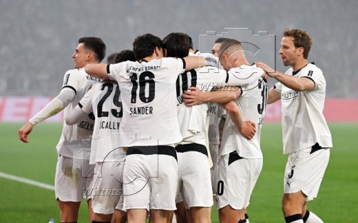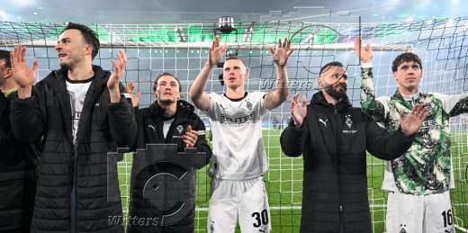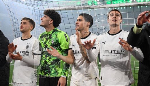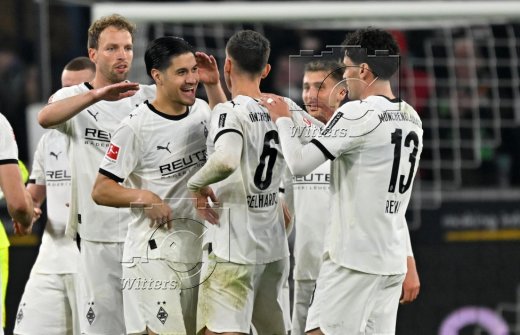 Schlussjubel v.l. Haris Tabakovic, Rocco Reitz, Nico Elvedi, Franck Honorat, Philipp Sander (Gladbach)