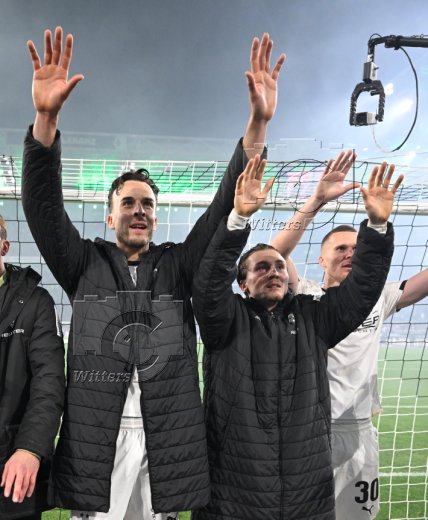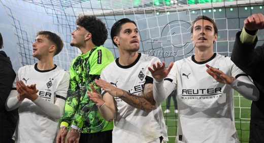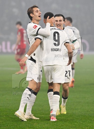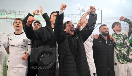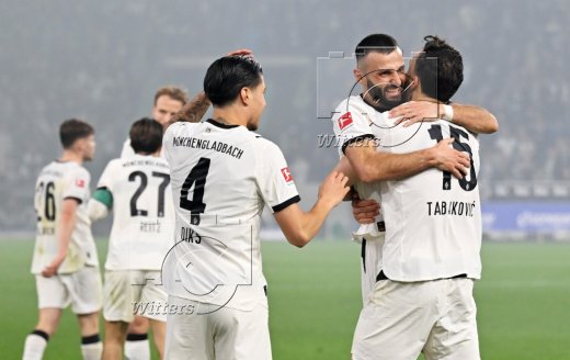 Schlussjubel v.l. Haris Tabakovic, Rocco Reitz, Nico Elvedi (Gladbach)