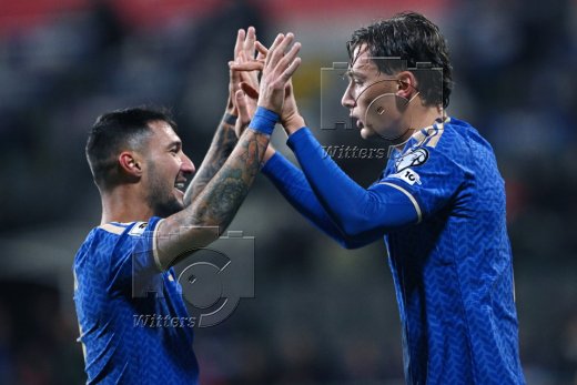 0:2 Tor, Jubel, v.l. Bryan Cristante, Torschuetze Pio Esposito (Italien)