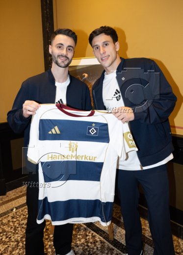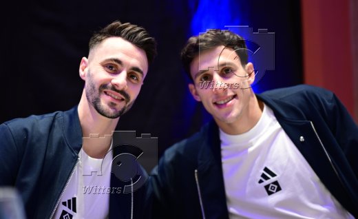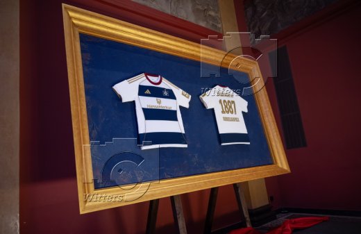 Praesentation Sondertrikot 1887. Bundesliga-Spiel, v.l. Dr. Eric Huwer (Vorstand Finanzen, HSV), Moderatorin Lisa Ramuschkat