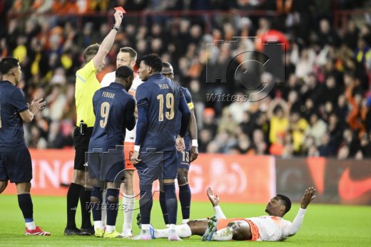 v.l. Schiedsrichter Sascha Stegemann (Deutschland), Stefan de Vrij, Denzel Dumfries (Niederlande, rote Karte)