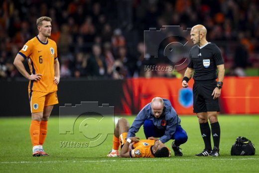 v.l. Matthijs de Ligt, Verletzung Jurrien Timber (Niederlande), Schiedsrichter Luis Miguel Branco Godinho (Portugal)