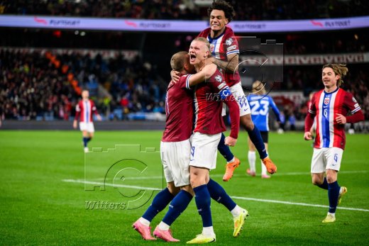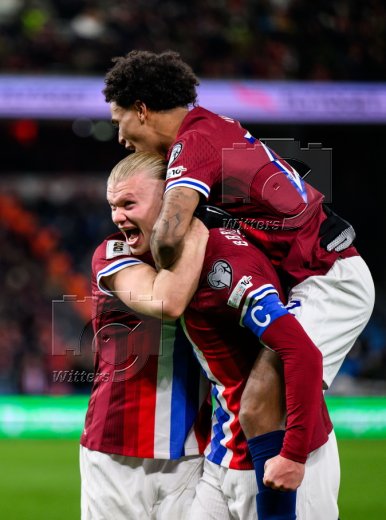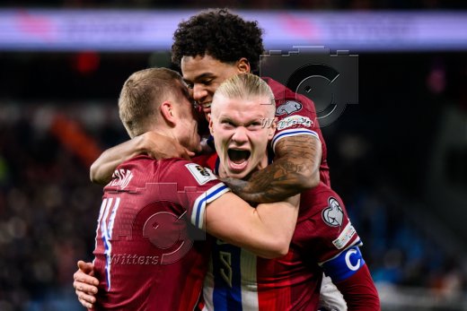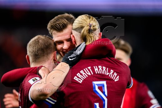 3:0 Tor, Jubel, v.l. Julian Ryerson, Torschuetze Erling Haaland, Oscar Bobb (Norwegen)