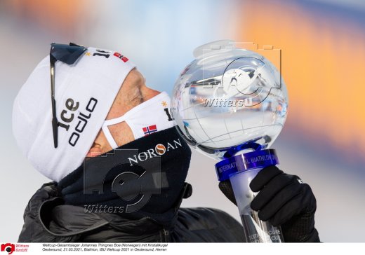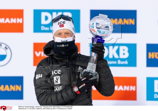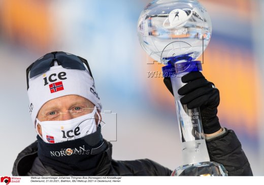 Weltcup-Gesamtsieger Johannes Thingnes Boe (Norwegen) mit Kristallkugel