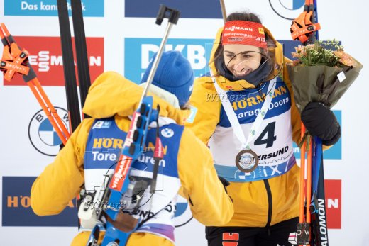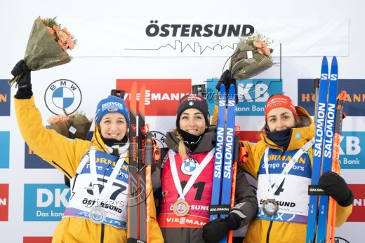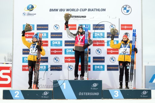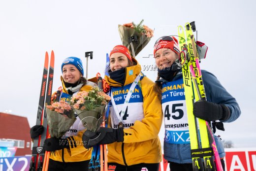 v.l. Franziska Preuss (Deutschland, 2. Platz), Siegerin Lisa Vittozzi (Italien), Vanessa Voigt (Deutschland, 3. Platz)