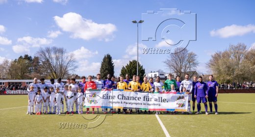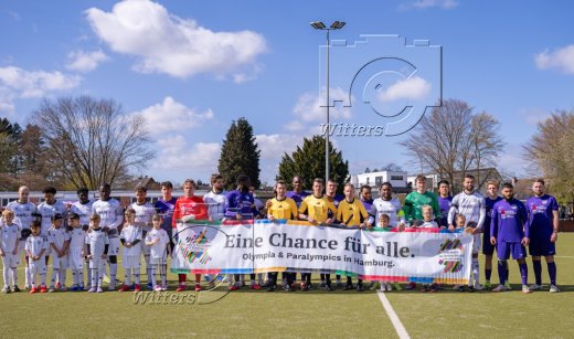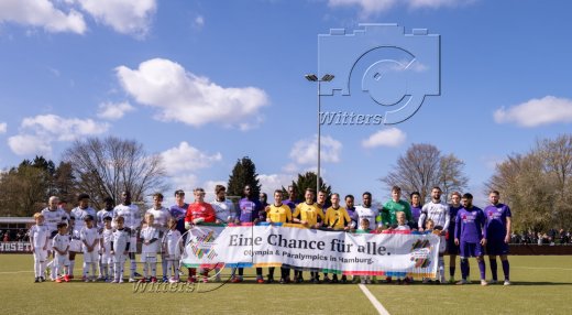 Mannschaften und Schiedsrichter Patrich Ittrich mit Schiedsrichterassistenten Florian Schwarze und Bjoern Lassen mit dem Banner ''Eine Chance fuer Alle'' zur Bewerbung Olympische und Paralympische Spiele in Hamburg
