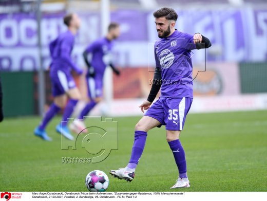 Maurice Trapp (Osnabrueck), Osnabrueck Trikots beim Aufwaermen, "Zusammen gegen Rassismus, 100% Menschenwuerde"