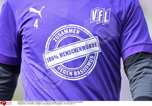 Osnabrueck Trikots beim Aufwaermen, "Zusammen gegen Rassismus, 100% Menschenwuerde"