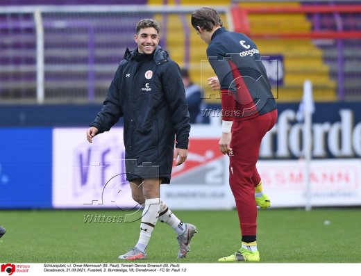 Schlussjubel, v.l. Omar Marmoush (St. Pauli), Torwart Dennis Smarsch (St. Pauli)