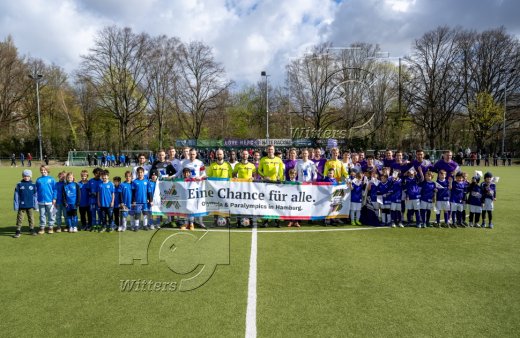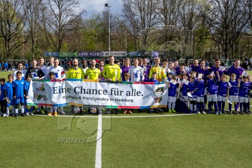 Mannschaften mit dem Banner ''Eine Chance fuer Alle'' zur Olympia-Bewerbung Hamburg
