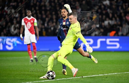 v.l. Bradley Barcola (PSG), Torwart Philipp Koehn (Monaco)