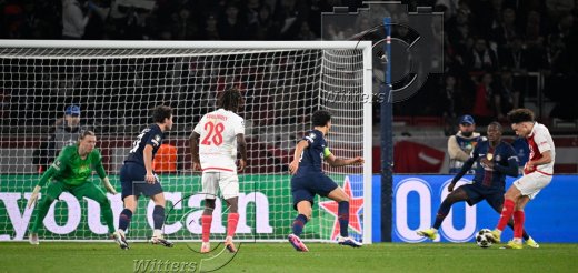 0:1 Tor, v.l. Torschuetze Maghnes Akliouche (Monaco), Nuno Mendes, Torwart Matvey Safonov (PSG)