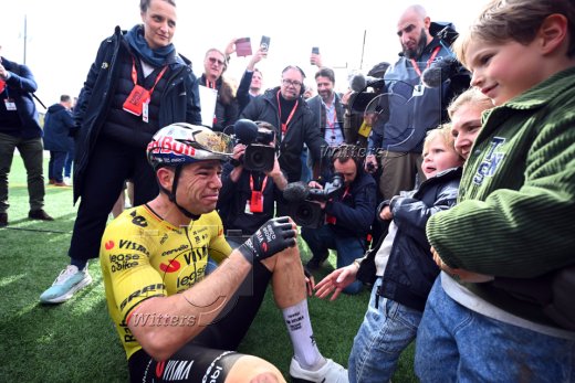 Sieger Wout van Aert (Belgien, Visma-Lease a Bike) mit Ehefrau Sarah de Bie und den Soehnen Jerome und Georges