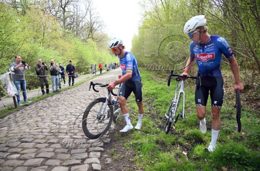 Mathieu van der Poel (Niederlande, Alpecin Deceuninck), Panne auf dem Waldweg bei Arenberg, Jasper Philipsen (Belgien, Alpecin Deceuninck, r.)