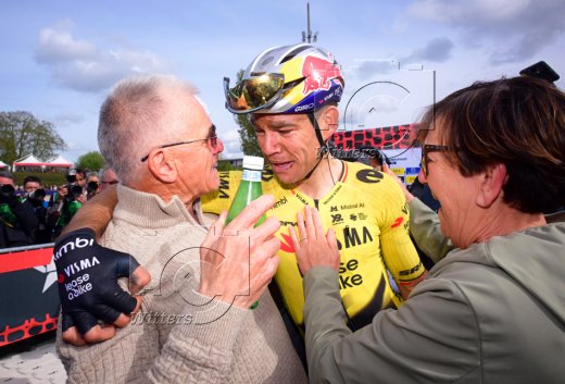 Sieger Wout van Aert (Belgien, Visma-Lease a Bike) mit Vater Henk van Aert und Mutter Ivonne van Aert