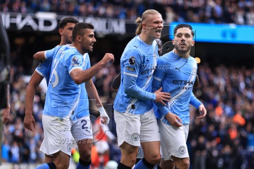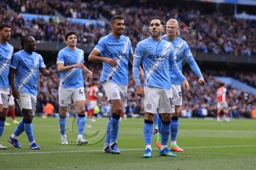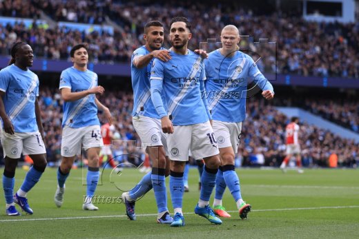 1:0 Tor, Jubel, v.l. Rodrigo ''Rodri'', Torschuetze Rayan Cherki, Erling Haaland (City)