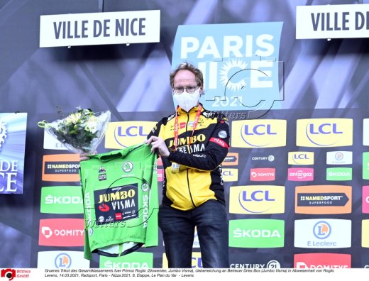 Gruenes Trikot des Gesamtklassements fuer Primoz Roglic (Slowenien, Jumbo Visma), Ueberreichung an Betreuer Dries Bos (Jumbo Visma) in Abwesenheit von Roglic