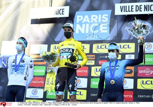 v.l. Aleksander Vlasov (Russland, Astana, 2. Platz), Gesamtsieger Maximilian Schachmann (Deutschland, Bora-Hansgrohe) im gelben Trikot, Ion Izagirre (Spanien, Astana, 3. Platz)