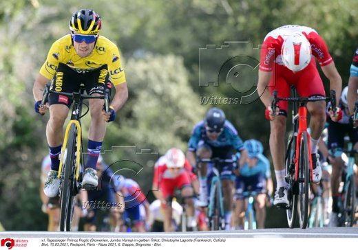 Primoz Roglic (Slowenien, Jumbo Visma) im gelben Trikot vor Maximilian Schachmann (Deutschland, Bora-Hansgrohe)