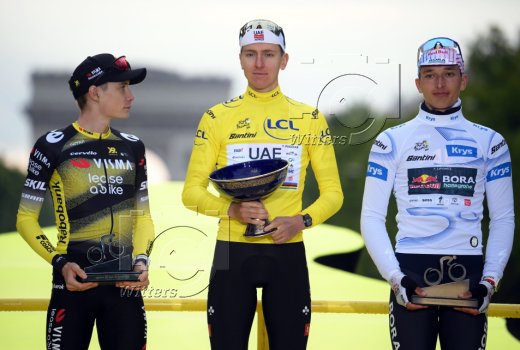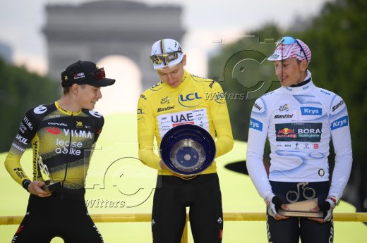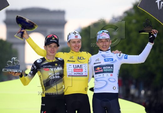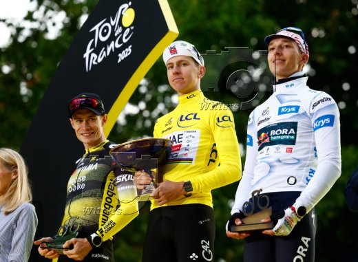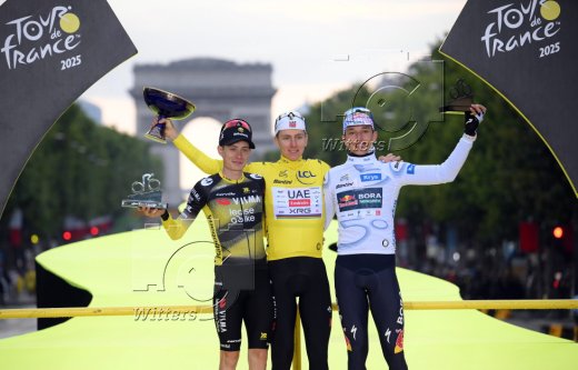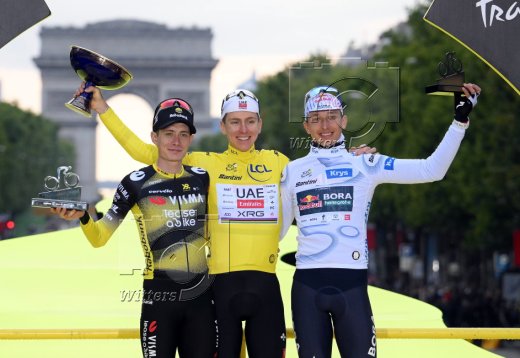 Gesamtwertung, v.l. Gesamtsieger Tadej Pogacar (Slowenien, UAE Team Emirates) im gelben Trikot, Jonas Vingegaard (Daenemark, Visma-Lease a Bike, 2. Platz), Florian Lipowitz (Deutschland, Red Bull - Bora-Hansgrohe, 3. Platz)