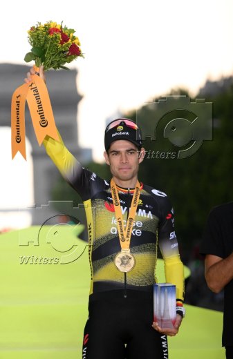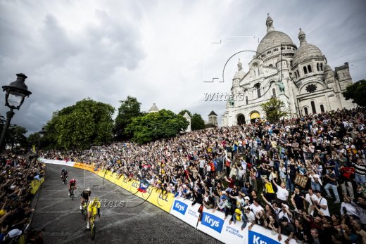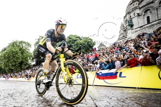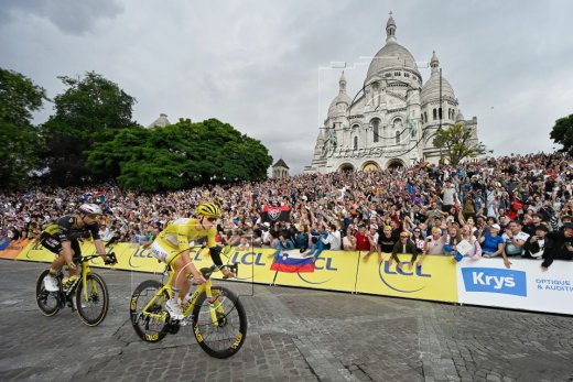 v.l. Tagessieger Wout van Aert (Belgien, Visma-Lease a Bike), Gesamtsieger Tadej Pogacar (Slowenien, UAE Team Emirates) im gelben Trikot vor der Basilika Sacre Coeur de Montmartre
