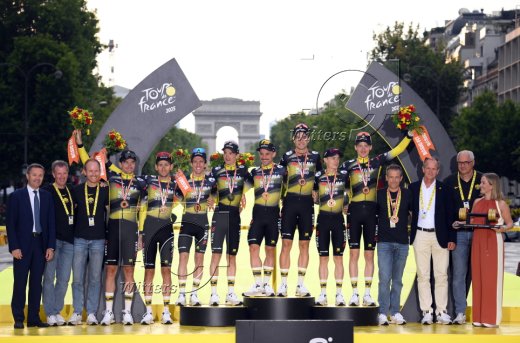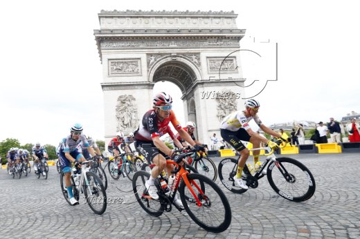v.l. Lenny Martinez (Frankreich, Bahrain Victorious), Geraint Thomas (Grossbritannien, Ineos Grenadiers), Nils Politt (Deutschland, UAE Team Emirates) auf dem Champs-Elysees vor dem Arc de Triomphe (Triumphbogen)