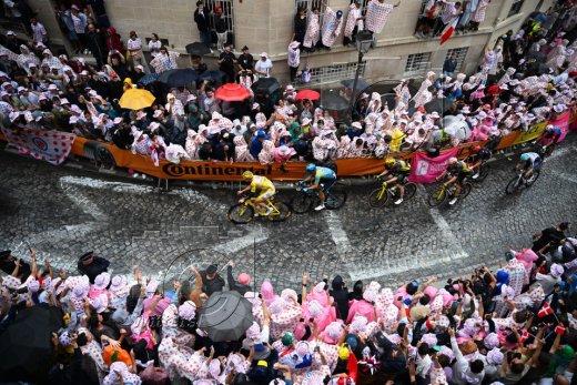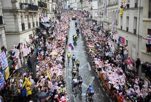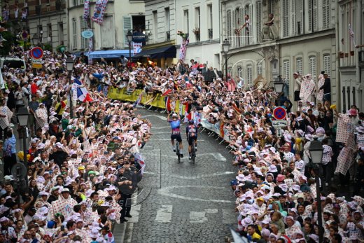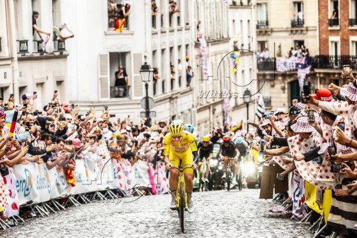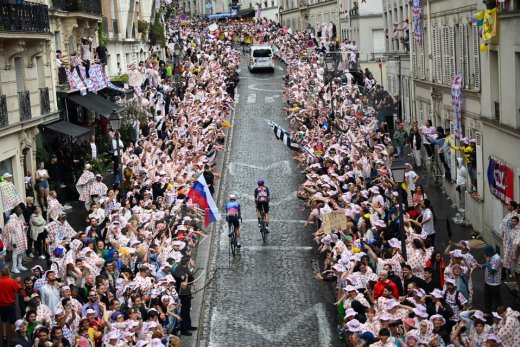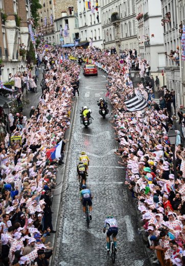 Tadej Pogacar (Slowenien, UAE Team Emirates, vorn) im gelben Trikot in der Rue Lepic im Stadtteil Montmartre