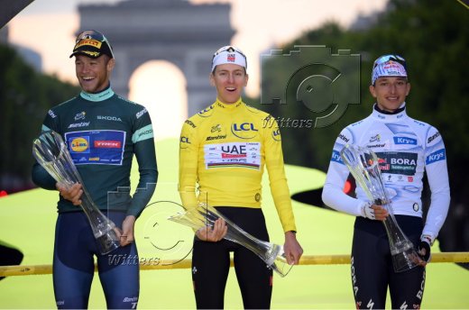 Gesamtwertung, v.l. Jonathan Milan (Italien, Lidl-Trek, Sieger gruenes Trikot), Gesamtsieger Tadej Pogacar (Slowenien, UAE Team Emirates) im gelben Trikot, Florian Lipowitz (Deutschland, Red Bull - Bora-Hansgrohe, Sieger des weissen Trikots als bester Nachwuchsfahrer)