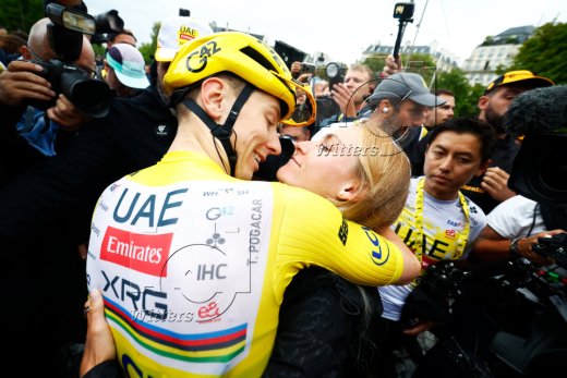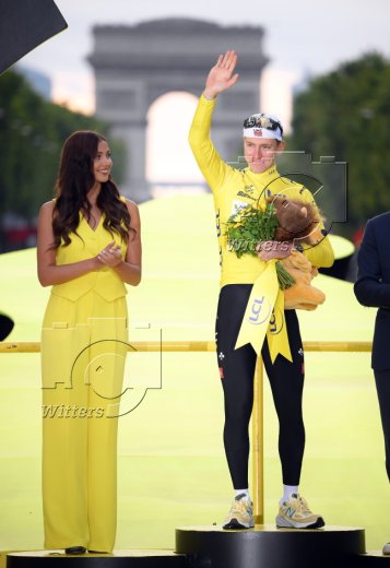 Gesamtsieger Tadej Pogacar (Slowenien, UAE Team Emirates) im gelben Trikot mit Freundin Urska Zigart