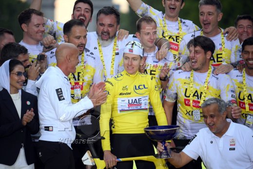 Gesamtsieger Tadej Pogacar (Slowenien, UAE Team Emirates) im gelben Trikot mit Team