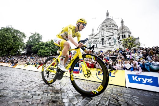 Tadej Pogacar (Slowenien, UAE Team Emirates) im gelben Trikot im Stadtteil Montmartre