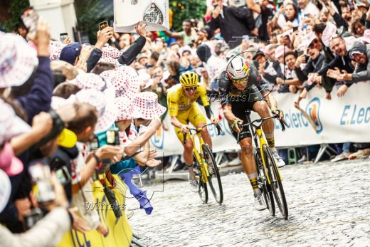 Tadej Pogacar (Slowenien, UAE Team Emirates) im gelben Trikot vor Tagessieger Wout van Aert (Belgien, Visma-Lease a Bike) in der Rue Lepic im Stadtteil Montmartre