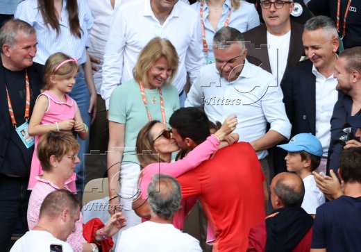 Sieger Novak Djokovic (Serbien) mit Ehefrau Jelena Djokovic und seinen Eltern Dijana und Srdjan Djokovic (hinten)